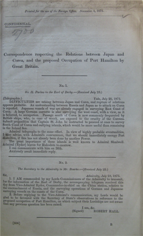 “한국과 일본 관계 및 영국의 거문도 점령 문제에 관한 문서. Correspondence respecting the Relations between Japan and Corea, and the proposed Occupation of Port Hamilton by Great Britain.”