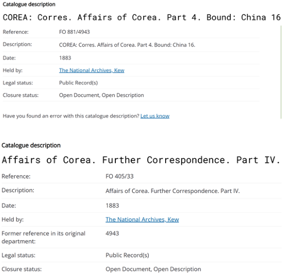 영국외무부는 제2차 조영수호통상조약(1883) 체결 및 비준과 관련해서 두 개의 Confidential Print를 제작합니다. 바로 FO 405/33과 FO 405/34입니다. 이는 FO 405 문서군에 속해 있는 문서철입니다. 그런데 FO405/33과 FO 405/34를 제작할 당시에는 “FO 405”라는 문서군 분류가 되어 있지 않았습니다. 이에 영국외무부는 두 개의 Confidential Print에 각각 4943과 4995라는 번호를 부여합니다. 그리고 FO 405라는 문서군 체계가 마련될 때, 4943과 4995 문서철은 FO 405/33, 405/34라는 문서철 번호가 부여되었습니다. 그렇다면 4943, 4995라는 원래 문서번호는 사라졌을까요? 아닙니다. 영국외무부는 본래 번호 앞에도 FO 881 문서군을 부여함으로써, FO 881/4943, FO881/4995라는 문서철 번호가 생성됩니다. 그래서 TNA를 검색해 보면 FO 405에서도, FO 881에서도 동일한 문서를 확인할 수 있습니다.