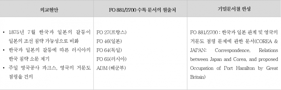 당시 영국외무부 내에서는 1875년 한국과 일본의 갈등에 관여하지 않았지만, 동아시아 관련해서 중요한 사안이라고 판단했던 것 같습니다. 이에 영국외무부는 1875년 11월 4일에 1875년 한국과 일본의 외교적 갈등과 이에 대한 영국 측 대응을 묶어서 FO 881/2700을 제작했습니다. 그 때 영국외무부의 사서들은 당시 한국과 일본의 외교 현안과 관련해서 다양한 문서들을 활용합니다. 그 문서들의 원출처들을 편집하여 하나의 문서철을 제작한 것입니다. FO 881/2700에 수록된 문서들의 원출처를 표로 간단하게 정리하면 다음과 같습니다.