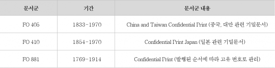 FO 405, 410은 각각 중국 혹은 일본 관련 Confidential Print임을 알 수 있습니다. 중국 관련 외교문서가 수록된 FO 17과 FO 228에 한국 관련 문서철이 포함된 것과 비슷한 맥락이라고 보시면 됩니다. 그렇다면 FO 881은 무엇일까요? 바로 FO 881은 Confidential Print들이 각국별, 혹은 주제별로 분류되기 이전 형태라고 생각하시면 됩니다. 잘 이해가 가지 않으실 수도 있겠습니다. 그렇다면 제가 제2차 조영수호통상조약의 체결 과정을 다룬 Confidential Print 사례를 들어 구체적으로 설명해 보겠습니다.