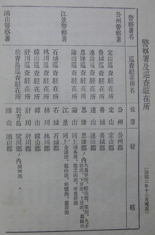 나는 개인적으로 논산 연구를 시작하면서 공공기관의 역사에 관심을 가지고 있었다. 1908년에 간행된 『충청남도도세일반』에 보면 공공기관의 관할 구역이 확인된다. 그 중에서 충남 지역의 경찰서는 공주경찰서, 강경경찰서, 홍산경찰서, 홍주경찰서, 대전경찰서로 크게 5개 구역으로 나누어져 있었다. 특이하게 봤던 것이 바로 강경경찰서였다. 읍치 소재지가 아님에도 불구하고 강경에 경찰서가 있었다. 그리고 관할 구역으로는 순사주재소로 석성, 임천, 한산, 서천, 어청도였다. 지역에 있으면 쉽게 알 수 있듯이 금강 연안을 따라 하구까지 내려가는 지역이고 심지어 서천 앞바다의 어청도까지 강경경찰서의 관할 구역이었다. 당시에는 금강 수로가 발달되어 있기 때문에 나타나는 현상이었다. 사실 강경에서 어청도까지는 매우 먼 곳인데 당시에는 수운으로 연결되어 있었다.