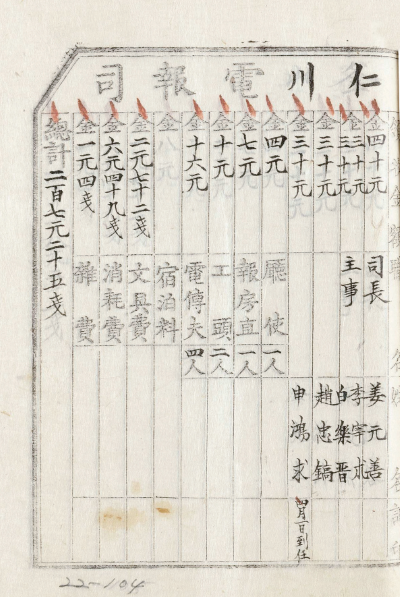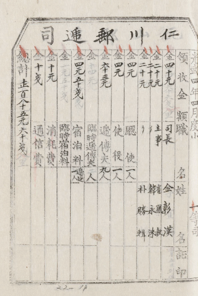 위 자료에서 왼쪽은 인천우체사, 오른쪽은 인천전보사 보고서이다. 해당 내용에는 각 기관의 인적 구성원과 월급 내용이 기재되어 있다. 우체사에는 사장, 주사, 청사, 사역 그리고 우리가 집배원이라고 알고 있는 체전부가 소속되어 있다. 전보사에는 사장, 주사, 청사, 고방직, 그리고 공두(工頭)라고 불리는 통신기사가 있었다. 물론 전전부(電傳夫)는 전보를 전달하는 집배원과 같은 역할이었다. 이들의 직책과 이름이 확인되어서 구성원을 복원하는데에는 어렵지 않았다.