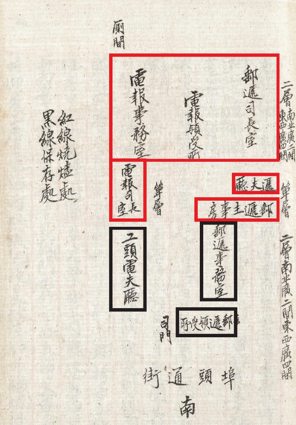 단층 건물 2동은 두 2층 건물 중간에 위치하였는데 서쪽에 있던 단층 건물은 전보사장실(電報司長室)과 공두전부청(工頭電夫廳)이 있었고, 동쪽 단층 건물에는 체부청(遞夫廳)과 우체주사방(郵遞主事房)이 있었다. 화재가 난 건물은 이 중에서 붉은 색으로 표시된 건물 이었고, 남아 있던 건물은 검은 색으로 표시된 건물이었다. 이를 통해 볼 때 인천우체사와 인천전보사는 다른 성격을 가지고 있지만 동일한 통신기관으로서 같은 건물에 위치해 있었다.