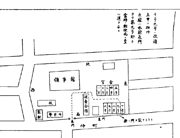 위 도면을 보면 일본영사관 내에서 6~9호 건물을 사용하고 있었고, 영사관 정문과는 달리 별도의 문이 설치되어 있다는 것을 알 수 있다. 이외에도 일본영사관에는 경찰서와 감옥도 함께 위치하고 있었다. 일본영사관에서 담당했던 업무가 매우 다양했다는 것을 알 수 있다. 그런데 건물 사용을 보면 인천우편국에서 많은 건물을 사용한 것으로 보아 우편 업무가 작지 않았던 것으로 보인다.